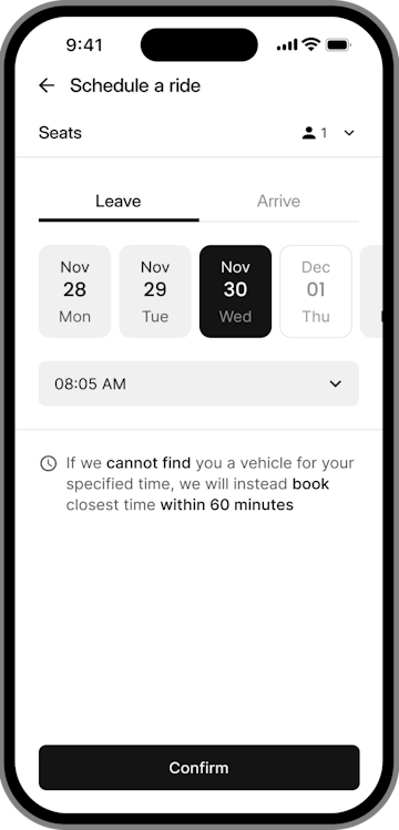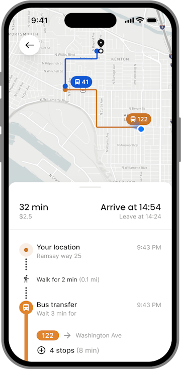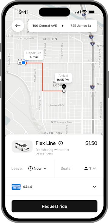 When you book a ride with our easy-to-use app, a bus will pick you up wherever you are within the designated service area and get you on your way within minutes.